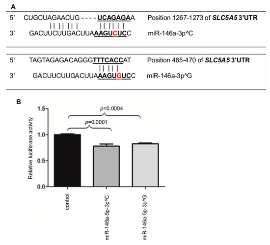 Positions of the putative miRNA binding sites in 3’UTRs of SLC5A5, identified by TargetScan and miRanda. Nucleotides of perfect complementarity are shown as a seed match (A) and the rs2910164 is indicated in red. (B) The effect of miR-146a-5p-3p^C or miR-146a-5p-3p^G on the luciferase activity mediated from the NIS 3′UTR is shown relative to control (cells transfected with control miR). The results are normalized to Renilla luciferase and derived from three experiments, each performed in triplicates. Binding of microRNAs to the 3′UTR of NIS resulted in a significant reduction in the luciferase activity for miR-146a-5p-3p^C (22%, p = 0.0001) and miR-146a-5p-3p^G (17%, p = 0.0004). The graphs show the mean, along with deviations from mean (SEM). Statistical analysis was performed using an unpaired t test.