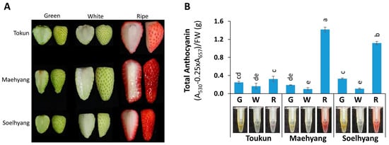 Strawberry (Fragaria × ananassa) fruits (A); and contents of total anthocyanin (B) in three developmental stages of fruits, namely, green, white and ripe stages of cultivar, Tokun, Maehyang and Soelhyang are used in this study. Data are presented as mean ± SD (n = 3). Fruit developmental stages of the cultivars varied significantly (p < 0.01) for total anthocyanin as determined by one-way ANOVA. Statistically significant differences in the total anthocyanin content are indicated by different letters as per Tukey’s pairwise comparisons. G, Green; W, White; R, Ripe.