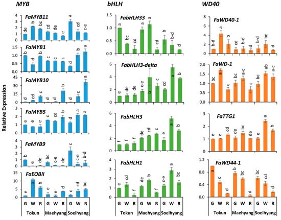 Among the four bHLH genes, FabHLH3 and FabHLH3-delta showed significantly increased expressions in the ripe fruits of Maehyang and Soelhyang compared to that of the green fruits, respectively, while its expression in the fruits of Tokun remained statistically unchanged (Figure 2). Of these, only the FabHLH3, however, exhibited significant positive correlation (p < 0.05) with FaMYB10 (Table S1). Among the WD40 protein coding genes, only the expressions of FaTTG1 were found to be significantly higher in the white and ripe fruits of Soelhyang while the expression of the other three genes were either decreased or statistically similar in both low and high anthocyanin cultivars. Taken together, it is apparent that FaMYB10 dominated the regulatory complex with approximately 20- and 36-fold higher expressions, along with the FabHLH3 and FabHLH3-delta genes, which showed approximately 3–4 times higher expression in ripe fruits of Maehyang and Soelhyang compared to that of the green fruits of low anthocyanin cultivar Tokun.
