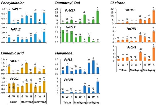 The most striking increasing pattern of expression was obtained for the uridine diphosphate-glucose:flavonoid 3-O-glucosyltransferase gene, FaUFGT1, involved in the very final step of anthocyanin biosynthetic pathway, showing around 123- and 313-fold higher expressions (compared to the respective green fruits) in the ripe fruits of high anthocyanin cultivars, Maehyang and Soelhyang (Figure 4).