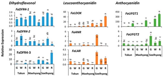 Higher expressions were observed for the genes involved in each of the late biosynthetic steps (Figure 4). Among the dihydroflavanol reductase genes, FaDFR4-3 showed increasing trend of expression from green to ripened stages of fruits in all three cultivars. However, the expressions were much higher in the ripe fruits of high anthocyanin cultivars, Maehyang and Soelhyang (~9 and ~24 folds, respectively) compared to only 2.29-fold increase in the low anthocyanin cultivar Tokun (Figure 4). The expressions of the other two genes, FaDFR4-1 and FaDFR4-2, did not show such contrastingly increasing patterns of expression between high and low anthocyanin cultivars. For these two genes, the expressions were similar in green and ripe fruits, but, interestingly, a general increase in the intermediate white stage is observed for each of the three cultivars.
