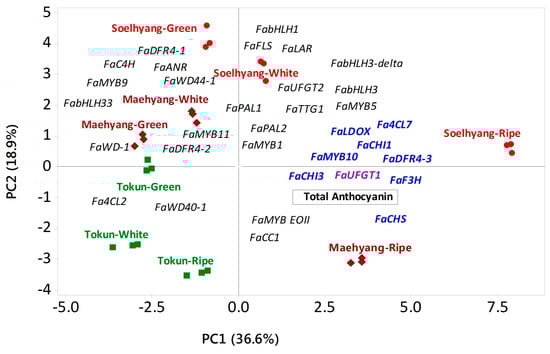 Biplot showing the association between the regulatory and biosynthetic genes with the total anthocyanin in three fruit developmental stages, namely, green, white and ripe fruits, of Fragaria × ananassa fruit as determined by Principal Component Analysis (PCA). The three varieties are shown in three different shapes and colors as positioned by their respective mean PC scores in PCA biplot. The total anthocyanin (shown in rectangular box) and the genes represent coefficients between PC1 and PC2. The most contributing genes in accumulating higher anthocyanin in ripe fruits of cultivars, Maehyang and Soelhyang, are shown by bold letters. PC, Principal Component.