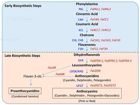 The genes involved in each step of the anthocyanin biosynthesis pathway were first manually searched using step-specific key words (such as “DFR”, “Dihydroflavanol”, etc. for identifying the DFR genes) from the annotated version of the whole genome of wild strawberry, Fragaria vesca (“Fvesca_V1.0_genemark_hybrid annotation” file, available from the Genome Database of Rosaceae in https://www.rosaceae.org/) (Table S2). Among these genes, the important regulatory, early- and late-biosynthetic genes whose expressions were to be studied in cultivated strawberry, Fragaria × ananassa were then selected based on their prior reports in previous studies on Fragaria vesca and/or Fragaria × ananassa. The F. vesca (wild strawberry) sequences of selected genes (from Table S2) were then used to identify corresponding Fragaria × ananassa (cultivated strawberry) sequences (including the isoforms) by using the “BLAST” tool against the Fragaria × ananassa draft genome (FANhybrid_r1.2_cds, available from the Strawberry garden database—http://strawberry-garden.kazusa.or.jp/). The list of the selected genes is shown in Table 2; the stepwise biosynthetic genes are marked in anthocyanin biosynthesis pathway in Figure 6; and the complete information are given in Table S3.