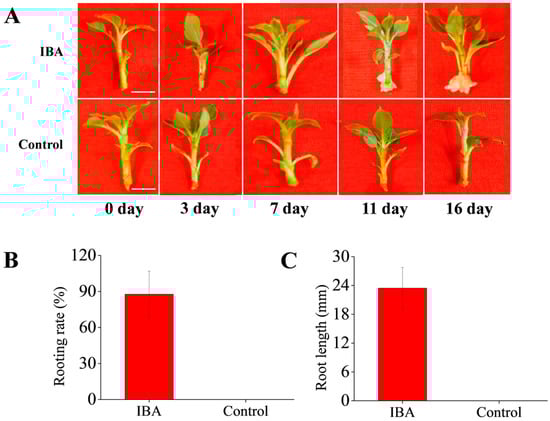 Effects of indole-3-butyric acid (IBA) on adventitious root formation in apple rootstock ‘T337’. (A) Morphological changes in ‘T337’ cultural cuttings after treatment with IBA and control for 0, 3, 7, 11, 16 days. Scale bars = 0.5 cm. (B) Rooting rate in ‘T337’ with IBA treatment and control at 16 days per 50 cuttings. (C) Root length in ‘T337’ with IBA treatment and control at 16 days per 50 cuttings.