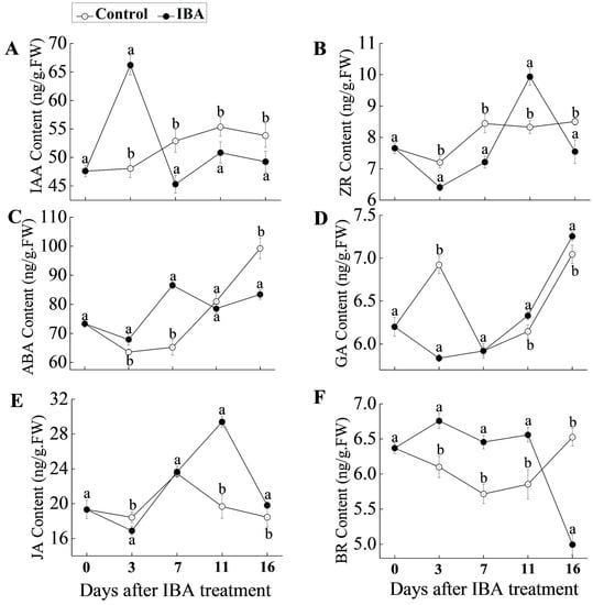 Endogenous hormone levels in ‘T337’ basal cuttings after treatment with IBA and control for 0, 3, 7, 11, 16 days. (A) Auxin (IAA) content; (B) Zeatin riboside (ZR) content; (C) Abscisic acid (ABA) content; (D) Gibberellins (GA) content; (E) Jasmonic acid (JA) content; and, (F) Brassinolide (BR) content. Statistically significant differences in IBA-treated cuttings and control on each day are indicated with ‘a’ and ‘b’. Data shows the average values ± SE of three independent experiments.