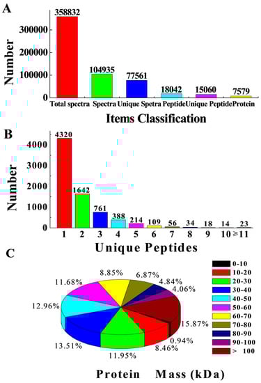 Results of the isobaric tag for a relative and absolute quantitation (iTRAQ) liquid chromatography/tandem mass spectrometry analysis of ‘T337’ basal cuttings with IBA treatment and control. (A) Identified proteins, Unique peptide: A protein-specific peptide; Unique spectra: spectra that matched unique peptides; (B) Number of unique peptides that were matched to proteins. The X-axis shows the unique peptide number of each protein, and the Y-axis shows the corresponding protein number; (C) Distribution of average molecular mass of identified proteins.