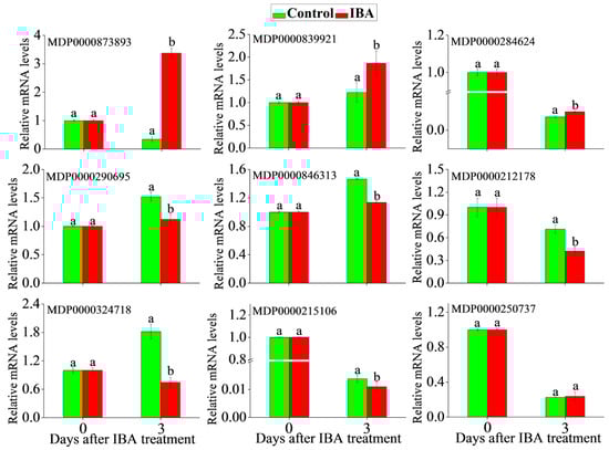 Analysis of change in mRNA level via qRT-PCR for several differential proteins mapped in phytohormone signaling pathway. The transcript levels at 0 d were normalized to value 1. Statistically significant differences in IBA-treated cuttings and control on each day were indicated with ‘a’ and ‘b’. Indole-3-acetic acid-amido synthetase (MDP0000873893), ACC oxidases (MDP0000839921), abscisic acid receptor PYL9 (MDP0000284624), indole-3-acetate O-methyltransferase 1 (MDP0000290695), two-component response regulator ARR1 (MDP0000846313), two-component response regulator ARR5 (MDP0000212178), ethylene-responsive transcription factor 4 (MDP0000324718), ABSCISIC ACID-INSENSITIVE 5-like protein (MDP0000215106), two-component response regulator ARR3 (MDP0000250737). Data shows the average values ± SE of three independent experiments. Letters above the bars indicate a statistically significant difference (p < 0.05), according to two-tailed t-test.