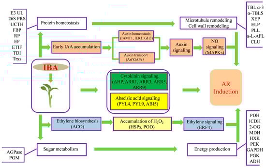 AR formation, as an essential aspect of vegetative propagation, is a complex process requiring changes in the expression of a series of genes or proteins that induce the formation of new roots from stem cuttings or other vegetative tissues. The induction of ARs by the exogenous application of IBA has been reported in many species [,,]. The underlying mechanism that is responsible for AR formation has not been comprehensively elucidated, especially at the level of the proteome. Therefore, an iTRAQ-based quantitative proteomic approach was used to provide new information pertaining to the induction phase (three days after IBA treatment) of IBA-induced AR formation. The discussion will focus on proteins related to phytohormone signaling, carbohydrate metabolism and energy production, reactive oxygen species (ROS) and nitric oxide (NO) signaling, protein homeostasis, and cell structure.