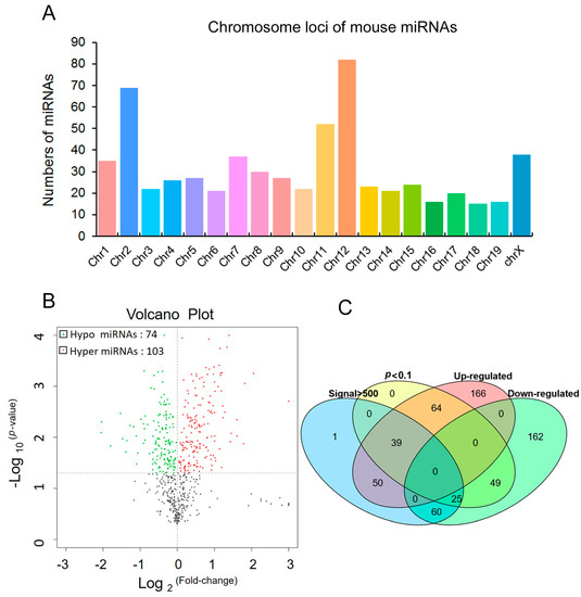MiRNA expression in hippocampi of antidepressant administration and control mice. (A) The numbers of miRNAs in mouse chromosome loci in Affymetrix array analysis; (B) Volcano plot of miRNA expression levels in antidepressant administration and control group. Each point represents a miRNA, “red” dot means hyper, “green” dot means hypo expression and “black” dot means none significance (antidepressant vs. control); (C) Venn diagram of miRNA array results. The ellipses in different color (blue, yellow, red and green) represent miRNAs in four groups: signal > 500 (175 miRNAs), p < 0.1 (177 miRNAs), up-regulated (319 miRNAs) and down-regulated (296 miRNAs), respectively. The overlapping parts of ellipses represent the intersection of different groups, such as 103 and 74 miRNAs were in up-regulated and down-regulated groups (p < 0.1), respectively.