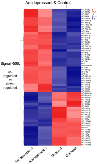 The data analysis of miRNAs expression profiling (data filtering, normalization and statistical calculations) was processed by R (R-Foundation for Statistical Computing, Vienna, Austria; version 2.12.1). Between 2 antidepressant treatments and 2 control tissues, the significant difference of miRNAs expression was selected by fold-change and a p-value with the following criteria: fold-change > 1 and p-value < 0.1 [71]. The heatmap was performed with normalized expression ((x − min)/(max − min)) of each miRNA by pheatmap package (https://cran.r-project.org/web/packages/pheatmap/index.html) of R language. The heat map was drawn. Blue, white and red indicate relatively low, middle and high expression of miRNAs, respectively.