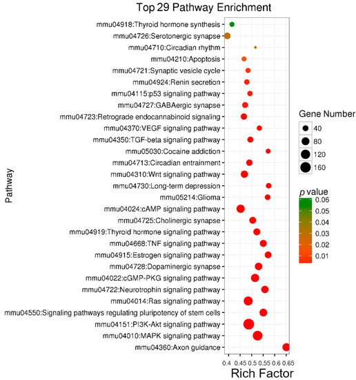 The bubble chart of up-regulated miRNAs in KEGG analysis. Y-axis represents the pathway name, X-axis represents the rich factor, the size of bubble represents the number of genes, and the color of bubble represents the p-value. VEGF: vascular endothelial growth factor; TGF: transforming growth factor; Wnt: wingless-type MMTV integration site; cAMP: cathelicidin antimicrobial peptide; TNF: tumor necrosis factor; cGMP-PKG: cyclic GDP-mannose pyrophosphorylase dependent protein kinase; Ras: rat sarcoma viral oncogene homolog; PI3K: phosphatidylinositol 3-kinase; Akt: RAC serine/threonine-protein kinase; MAPK: mitogen-activated protein kinase.