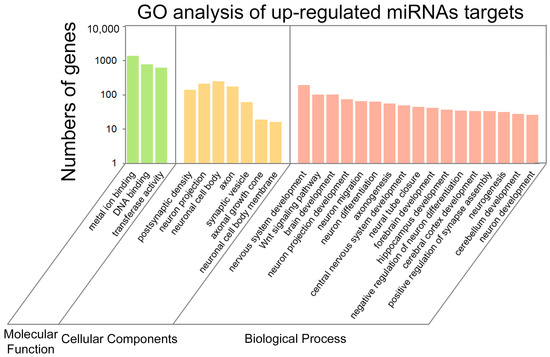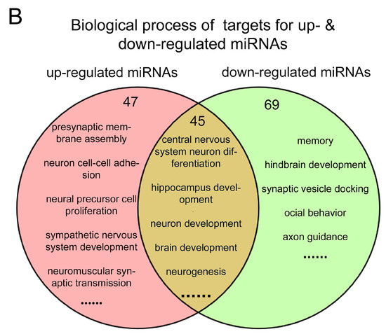 In the GO analyses of BP, 92 items in up-regulated miRNAs and 114 items in down-regulated miRNAs were found to be associated with neural development (Figure 5B, Tables S13–S15). 47 and 69 items were specifically abundant in up-regulated and down-regulated miRNAs, respectively. 45 GO items were found overlapping in up- and down-regulated miRNAs, for example neuronal differentiation and hippocampal development.