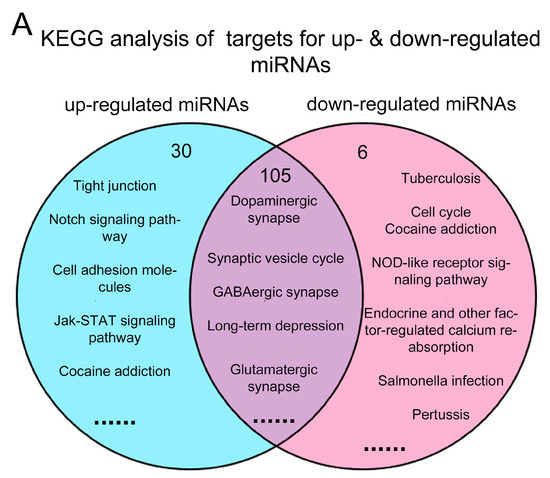 In the KEGG analysis, most of the pathways were overlapped between two groups (105 out of 135 in up-regulated miRNAs and 105 out of 111 in down-regulated miRNAs) (Figure 5A and Table S16). Many of them were involved in neural development, for instance the dopaminergic synapse, synaptic vesicle cycle, GABAergic synapse and long-term depression. 30 pathways were specific abundant in up-regulated miRNAs, for example the tight junction, notch signaling pathway and cell adhesion molecules, while only 6 pathways were enriched in down-regulated miRNAs.