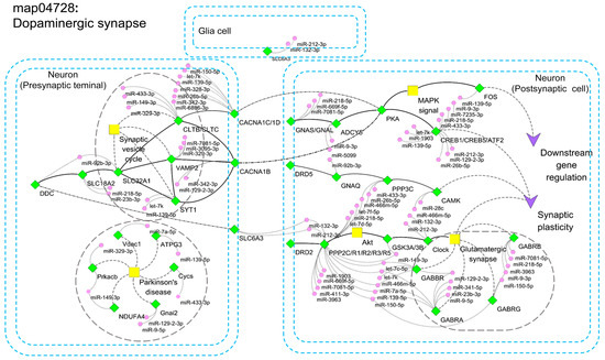 Previous studies have shown that antidepressant targeted Na+/Cl−-coupled dopaminergic neurotransmitter uptake defines a key therapeutic strategy to treat clinical depression and neuropathic pain [37,38,39,40]. We found that 71 predicted targets of up-regulated miRNAs and 39 predicted targets of down-regulated miRNAs are involved in the dopaminergic synapse signals (Figure 3 and Figure S4, and Table S17). Overall, 26 predicted targets were overlapped in these two groups, 45 and 13 predicted targets were specifically abundant in up-regulated and down-regulated miRNAs that are involved in regulating dopaminergic synapse, respectively (Figure S4 and Table S17). Interestingly, we found that many miRNAs (18 of 21) negatively regulate dopaminergic synapse pathways by inhibiting the positive genes (Figure 6). Moreover, some sub-pathways in hippocampal neurons might be modulated by up-regulated miRNAs, such as synaptic vesicle cycle, glutamatergic synapse, mitogen-activated protein kinase (MAPK) signal, and RAC serine/threonine-protein kinase (Akt) signal. Some miRNAs may alter the positive regulators that are associated with Parkinson’s disease.