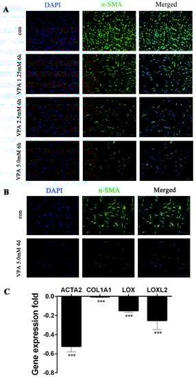 Valproic acid (VPA) is a novel class of histone deacetylase (HDAC) inhibitor. hHSCs were treated with VPA (1.25, 2.5 and 5.0 mM) for 6 h and 4 days (d), and the expression levels of α-SMA were determined by immunofluorescence (Figure 1A,B). Immunofluorescence microscopy revealed that the α-SMA expression levels in VPA (1.25, 2.5 and 5.0 mM) for the 6-h group were decreased in contrast to those of the control (con) group (Figure 1A). However, the α-SMA expression in the VPA 5.0 mM 4-day group revealed more significantly decrease than any VPA group (1.25, 2.5 and 5.0 mM) for 6 h and the con (Figure 1B). The mRNA expression levels of ACTA2, COL1A1, LOX and LOXL2 in hHSC myofibroblasts (cultured in the absence or presence of 5.0 mM VPA for 4 days) were quantified using qPCR. mRNA expression levels were more significantly suppressed relative to that in Figure 1C. Thus, 5.0 mM VPA treatment for 4 days was selected for hHSC myofibroblasts induction into an inactive phenotype. The VPA group described below represents VPA 5.0 mM 4 days (quiescent hHSC), while the con group represents activated hHSC.