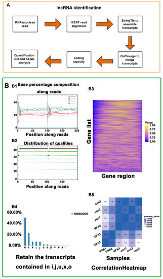 Overview of sequencing RNA (RNA-seq) in hHSC myofibroblasts. Firstly, we employed hierarchical indexing for spliced alignment of transcripts (HISAT) to align clean reads to the human reference genome (hg19/grch37). Secondly, we assembled the transcripts by StringTie for each sample and then used Cufflinks to merge the assembled transcripts. Thirdly, we combined three computational methods, CPC/txCdsPredict/CNCI/Pfam, to distinguish the mRNAs and long noncoding RNAs (lncRNAs) in the assembled transcripts. We applied Bowrie2 to compare clean reads to the reference sequence and then used RNA-Seq by Expectation Maximization (RSEM) to calculate for the expression levels of the genes and transcripts (A). To ensure the reliability of further data analysis at each step of data acquisition or analysis process, we applied a specific filter and check, including Base msaa distribution, sample correlation and sequencing depth, to monitor the data quality (B), and Figure includes Base distribution (B1), base mass distribution (B2), gene coverage map (B3), lncRNA classification chart from NONCODE (B4) and B5 is sample (con1, con2, con3 and VPA1, VPA2, VPA3 biological duplication) correlation (B5).