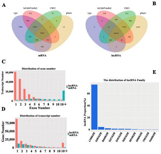 An average of 24,169 known lncRNAs, 7469 known mRNAs, 3922 novel lncRNAs and 2244 novel mRNAs were identified in each sample (Table S2). The prediction of lncRNA coding ability in hHSCs is presented in Figure 2A,B. The number of transcripts in the exon analysis suggested that the lncRNAs and mRNAs have a concentrated number of exons ranging from 1–3 and 10+, whereas the average number of mRNA exons was greater than that of the lncRNA exons (Figure 3C). The transcript number distributions of the lncRNA and mRNA genes indicated that most of the lncRNA and mRNA genes contained 1–5 transcripts, and the largest proportion of the lncRNA and mRNA genes contained only one transcript (Figure 3D). The distribution patterns of the lncRNAs and mRNAs in hHSC myofibroblasts were similar. Next, INFERNAL [] was employed to compare lncRNAs with the Rfam database for annotations and lncRNA classification (RF00017, RF01855, RF00998, RF01295, RF01045, RF01856, RF00100, RF00005, RF01061 and RF00994). Most of the lncRNAs in the hHSC myofibroblasts were noted belong to the RF00017 family ID (Figure 3E).