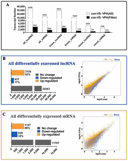 Profiling of the differentially expressed (DE) lncRNAs and mRNAs in the hHSC myofibroblasts between the activated hHSCs (con) and quiescent hHSCs (VPA). (A) Histograms represent the significant and nonsignificant differences in transcripts between the con (activated hHSC) and VPA (quiescent hHSC), con-VS-VPA (All) is the significant differences, whereas the con-VS-VPA (Filter) represents the significant differences only. (B,C) Histograms and Scatter plot of the co-expressed transcripts between con and VPA. (B,C) represent the lncRNAs and mRNAs, respectively. Blue denotes downregulated RNA transcripts, orange denotes the upregulated RNA transcripts, and brown denotes the nonregulated RNA transcripts in VPA (quiescent hHSC) compared with con (activated hHSC).