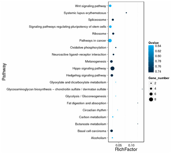 Gene ontology (GO) functional enrichment analysis indicated that most of the enriched GOs were involved in 1347 biological processes, 661 cellular component and 243 molecular functions (Figure S1). The DE lncRNAs target genes were identified to be significantly enriched for five functional terms, of which four terms, such as nucleosome, DNA bending complex, DNA packaging complex and actin cap, were enriched from the cellular component ontology, one term, growth factor binding, was from the function ontology (Table 1). Kyoto Encyclopedia of Genes and Genomes (KEGG) analysis demonstrated that the significantly (p < 0.05) enriched pathways in the DE lncRNAs target genes correspond to the Hippo signaling pathway (Figure 5 and Table S3). In this study, some DE lncRNAs regulated hHSCs activation by participating in nucleosome, DNA bending/packaging complex, chromatin assembly, growth factor binding and the Hippo signaling pathway. However, these results also require further validation.