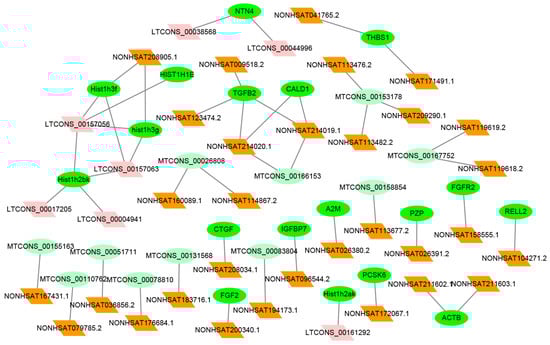 Co-expression network analysis demonstrated 38 DE lncRNAs target 30 mRNAs, including 11 novel mRNAs (light green), and each lncRNA was co-expressed with one or multiple mRNAs (Figure 6). The CTGF, FGF2 and NTN4 were co-expressed with NONHSAT208034.1, NONHSAT200340.1 and two lncRNAs, including LTCONS_00038568 and LTCONS_00044996. The top 10 regulated mRNAs and their co-expressed lncRNAs were listed in Table 2. Additionally, other additional information (fold differences; location) for co-expressed lncRNAs and mRNAs were listed in Table S3.
