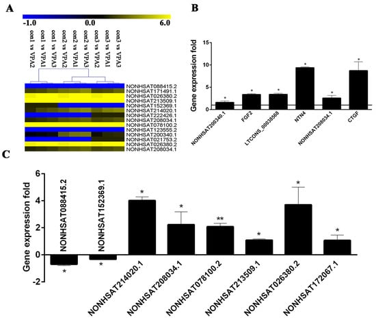 Verification of RNA-seq data. Heat maps show the differential expression fold (log2Ratio) for eight DE lncRNAs and three pairs of co-expressed lncRNAs-mRNAs between con (activated hHSC) and VPA (quiescent hHSC). Blue represents downregulation, whereas yellow indicates upregulation (A). The sequencing differential expression of CTGF, FGF2 and NTN4 is shown in Table 2. The expression folds of eight DE lncRNAs and three pairs of co-expressed lncRNAs-mRNAs in VPA (quiescent hHSC) were normalized against con (activated hHSC) (B,C). The relative expression levels were normalized to the expression amount of glyceraldehyde-3-phosphate dehydrogenase (GAPDH); (* p < 0.05, ** p < 0.01).