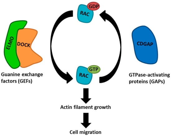 Recently, it has become apparent that engulfment and cell motility (ELMO) genes play central roles in the dissemination and invasion of cancer cells [,,,,,]. In humans, the ELMO family consists of three proteins, namely ELMO1, ELMO2, and ELMO3, which are involved in cytoskeleton rearrangements during phagocytosis and cellular migration via the activation of Ras-related C3 botulinum toxin substrate (RAC) proteins [,,]. The ELMO proteins lack a catalytic domain but function as scaffolding proteins regulating the spatiotemporal localization and activity of Dedicator Of Cytokinesis (DOCK) guanine exchange factors (GEFs), which are required to promote the active, GTP-bound form of RAC proteins []. On the other hand, GTPase activating proteins (GAPs), such as ARHGAP31 (CDGAP) may return RAC to its inactive, GDP-bound state [,]. The activation of RAC proteins promotes the growth of actin filaments, which drive cell migration and invasion of cancer cells [,,] (Figure 1). In glioblastoma, ELMO1 has been shown to be specifically abundant in invasive areas of the tumors and to be central for promoting cell migration and invasion via activation of RAC1 [,,]. On the contrary, less is known about the roles of ELMO2 and ELMO3 in glioblastoma.