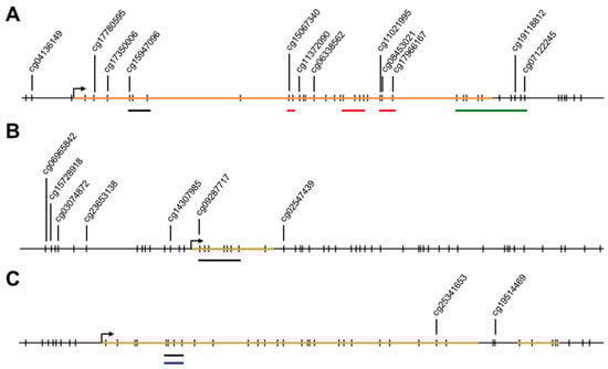 Overview of the CpG sites analyzed for each of the ELMO promoters in this and previous studies. The displayed regions each corresponds to 600 bp. Vertical bars represent CpG sites. CpG sites, which have Illumina CpG loci IDs (cg#) are indicated. The orange horizontal lines represent exons. Black bars underline the CpG sites studied here. Red bars underline the CpG sites studied in []. The green bar underlines the CpG sites studied in []. The blue bar underlines the CpG sites studied in []. (A) ELMO1; (B) ELMO2; (C) ELMO3.