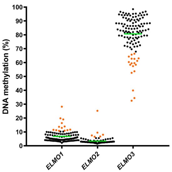 DNA methylation levels in the glioblastoma samples. Hypermethylated cases for ELMO1 and ELMO2 and hypomethylated cases for ELMO3 are indicated in orange color. The green bars indicate mean methylation levels for each gene promoter CpG island.