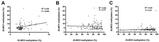 Correlations between the methylation levels of the individual ELMO gene promoter CpG islands. (A) ELMO1 vs. ELMO2; (B) ELMO1 vs. ELMO3; (C) ELMO2 vs. ELMO3.