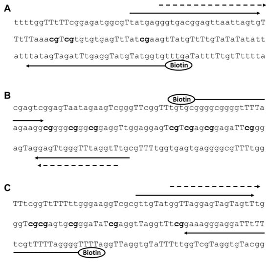 Primer design for each of the pyrosequencing assays. PCR Primes are denoted as solid arrows and sequencing primers as dashed arrows. Uppercase T denotes cytosines, which have been converted to uracil during the sodium bisulfite treatment. The CpG sites analyzed are indicated in bold. (A) ELMO1; (B) ELMO2; (C) ELMO3.