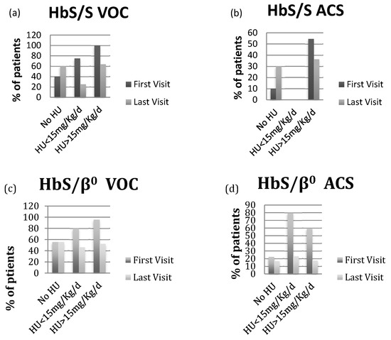 ACS prevalence, in the No-HU treated group, was similar between the first (22%) and the last visit (28%), respectively. Finally, even the number of mean episodes of ACS per patient was similar (0.2 vs. 0.28)