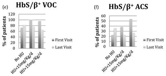 (a,c,e) VOC prevalence at first and last visit based on HU status in patients with HbS/S, HbS/β0-thalassemia and HbS/β+-thalassemia; (b,d,f) ACS prevalence at first and last visit based on HU status in patients with HbS/S, HbS/β0-thalassemia and HbS/β+-thalassemia.