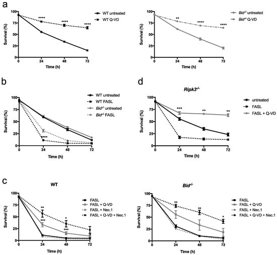 Upon in vitro culturing in the absence of specific cytokines, neutrophils undergo spontaneous apoptosis. As shown in Figure 1a, spontaneous apoptosis of primary bone marrow-derived mouse neutrophils occurred by a classical caspase-dependent mechanism, as it was fully blocked by the pan-caspase inhibitor Q-VD-OPh. Wild-type (WT) and Bid−/− neutrophils died with the same kinetics, indicating that BID does not contribute to spontaneous neutrophil apoptosis (Figure 1a,b). We next tested the effect of crosslinked FASL on the viability of WT and Bid−/− neutrophils over time. Primary neutrophils were isolated from the bone marrow of mice or, alternatively, neutrophils were differentiated in vitro using conditional Hoxb8, which allows working with many cells [,,]. Primary as well as in vitro differentiated WT neutrophils were highly sensitive to FASL-induced cell death, whereas cell death was significantly delayed upon loss of BID (Figure 1b and Figure S1a). Of note, Bim−/− primary neutrophils died with the same kinetics in response to FASL as WT controls (Figure S2). Interestingly, pan-inhibition of apoptotic caspases by Q-VD-OPh had only a partial protective effect from FASL in WT cells, whereas the viability of Bid−/− neutrophils was again higher and comparable to untreated controls (Figure 1c and Figure S1b). Additional inhibition of the enzymatic activity of RIPK1 by necrostatin-1 was required to further increase viability in FASL-treated cells (Figure 1c and Figure S1b). However, necrostatin-1 alone had no protective effect (Figure 1c). Furthermore, genetic ablation of RIPK3 resulted in a full protection from FASL-induced killing by Q-VD-OPh, with significantly higher viabilities compared to untreated controls (spontaneous apoptosis) at later timepoints (Figure 1d and Figure S1c). Taken together, these data suggest that FASL-induced apoptosis may switch to RIPK1- and RIPK3-dependent cell death when caspases are blocked and that, interestingly, BID seems to contribute to such a switch.