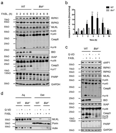 To further investigate the type of FASL-induced cell death, we analyzed protein lysates prepared from FASL-stimulated neutrophils at various time points by immunoblotting. As shown in Figure 2a,c, stimulation of FASL caused rapid processing of initiator caspase-8 into its fully active p18 fragment in WT cells. Cleavage of caspase-8 concurred with processing of procaspase-3 into its active form as well as cleavage of the caspase-3 substrate PARP. Additionally, enzymatic activation of caspase-3/-7 was confirmed by fluorogenic DEVDase assay. Caspase-3/-7 activity was observed within a few hours and peaked after 4 h. However, in absence of BID, much lower caspase-3/-7 processing and enzymatic activity levels could be measured, consistent with the observed delay in cell death in Figure 1 (Figure 2a–c). Moreover, a slight decrease in XIAP protein expression was detected over time in WT neutrophils, which was not apparent in the absence of BID (Figure 2a). Interestingly, cIAP1 protein levels strongly decreased in response to FASL in both WT and Bid−/− neutrophils through a caspase-dependent mechanism (Figure 2c). Due to the findings that inhibition of caspases could not fully restore viability upon FASL treatment, translocation of MLKL from an aqueous fraction to a detergent (integral membrane enriched) fraction, which is considered a hallmark of necroptosis [], was assessed. MLKL was found only in the aqueous fraction in response to FASL alone while upon blockage of caspases MLKL was also found in the detergent fraction in both WT and Bid−/− neutrophils, suggesting translocation of MLKL to membranes (Figure 2d). Taken together, our data show that, in response to FASL, mouse neutrophils undergo caspase-dependent apoptosis, which is accelerated by BID. However, in the absence of caspase activity cell death switches from apoptosis to necroptosis with translocation of MLKL to membranes.