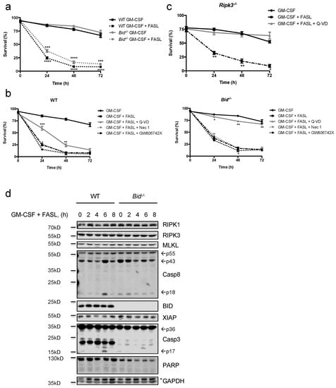 GM-CSF-primed neutrophils remain sensitive to FASL killing. (a) Primary WT and Bid−/− neutrophils were primed with GM-CSF (1 ng/mL) for 30 min prior to stimulation with FASL (100 ng/mL) for indicated time points. Viability was assessed by flow cytometry. n ≥ 3, mean ± SEM. (b) Primary WT and Bid−/− neutrophils were primed with GM-CSF (1 ng/mL) for 30 min and pre-treated with either Q-VD-OPh (20 μM), Nec.1 (20 μM) or the mouse MLKL inhibitor GW806742X (1 μM) for 30 min followed by stimulation with FASL (100 ng/mL) for indicated time points. Viability was assessed by flow cytometry. n ≥ 3, mean ± SEM. (c) In vitro differentiated Ripk3−/− neutrophils were primed with GM-CSF (1 ng/mL) for 30 min prior to stimulation with FASL (100 ng/mL) with or without Q-VD-OPh (20 μM) for indicated time points. Viability was assessed by flow cytometry. n ≥ 3, mean ± SEM. (a–c): p < 0.05 (*), p < 0.01 (**), p < 0.005 (***) and p < 0.001 (****). (d) In vitro differentiated WT and Bid−/− neutrophils were primed with GM-CSF (1 ng/mL) for 30 min and subsequently treated with FASL (100 ng/mL) for 0–8 h. Lysates were assessed by immunoblotting. Presented immunoblots are representative of at least two independent experiments.