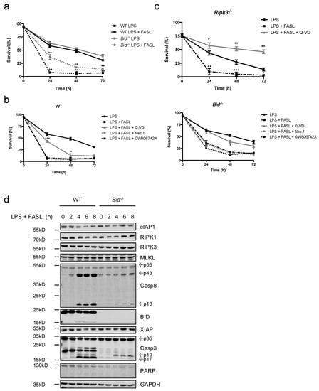 LPS-primed neutrophils remain sensitive to FASL killing. (a) Primary WT and Bid−/− neutrophils were primed with LPS (10 ng/mL) for 30 min prior to stimulation with FASL (100 ng/mL) for indicated time points. Viability was assessed by flow cytometry. n ≥ 3, mean ± SEM. (b) Primary WT and Bid−/− neutrophils were primed with LPS (10 ng/mL) for 30 min, pre-treated with either Q-VD-OPh (20 μM), Nec.1 (20 μM) or the mouse MLKL inhibitor GW806742X (1 μM) for 30 min followed by stimulation with FASL (100 ng/mL) for indicated time points. Viability was assessed by flow cytometry. n = 3, mean ± SEM. (c) In vitro differentiated Ripk3−/− neutrophils were primed with LPS (10 ng/mL) for 30 min prior to stimulation with FASL (100 ng/mL) with or without Q-VD-OPh (20 μM) for indicated time points. Viability was assessed by flow cytometry. n ≥ 3, mean ± SEM. (a–c): p < 0.05 (*), p < 0.01 (**) and p < 0.005 (***). (d) In vitro differentiated WT and Bid−/− neutrophils were primed with LPS (10 ng/mL) prior to stimulation with FASL (100 ng/mL) for 0–8 h. Lysates were subjected to immunoblot. Presented immunoblots are representative of at least two independent experiments.