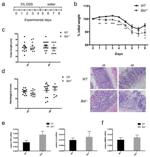 To investigate the role of BID in development and resolution of acute colitis mediated predominantly by neutrophils and macrophages, we added 3% DSS to the drinking water for five days (Figure 5a). There was no difference in colon lengths between untreated WT and Bid−/− mice (WT: 8.54 ± 0.24 cm, Bid−/−: 8.44 ± 0.28 cm; means ± SEM, n = 5 per genotype). Both WT and Bid−/− mice developed colitis over time observed by constant weight loss and shortening of their colons (Figure 5b,c). As soon as DSS-containing water was replaced by normal water at Day 5 mice started to recover and gained weight again from Day 7 onwards. However, the weight loss in Bid−/− mice was significantly more pronounced compared to WT mice and recovery phase was delayed (Figure 5b). DSS treated Bid−/− mice showed a trend to shortened colons—consistent with increased inflammation—at the endpoint of eight days compared to WT mice, but this did not reach statistical significance (Figure 5c). Histopathological scoring from colon samples of Bid−/− as well as WT mice displayed minor differences (Figure 5d). Slightly higher Tnfα and Il-6 mRNA levels could be quantified in colon pieces from Bid−/− mice after five days of treatment compared to WT controls (Figure 5e). Furthermore, differences in number of neutrophils in inflamed colon pieces were investigated. The matrix metalloprotease MMP9 was used as indication for neutrophil numbers, as activated neutrophils are a major source of this protease. Mmp9 mRNA was slightly higher in colons of Bid−/− mice after five days of treatment, suggesting a higher neutrophil count in the colon (Figure 5f).