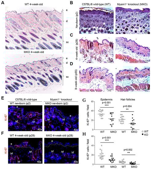 Skin of Mysm1-deficient mice is atrophic. (A–D) Hematoxylin & Eosin staining of paraffin-embedded skin samples derived from three different age groups of Mysm1-deficient mice and their wild-type littermates, as indicated (e: epidermis, d: dermis, sc: subcutis); (E–H) IF analysis of proliferation marker Ki-67 in (E) newborn and (F) 4-week-old Mysm1−/− and wild-type skin, and corresponding statistical summaries (Ki-67 in red, DAPI-stained nuclei in blue, n > 4, representative images shown, original magnification 40×, each dot in the graphical summary represents the count of Ki-67+ cells in one high power field) in skin of (G) newborn and (H) 4-week-old mice.