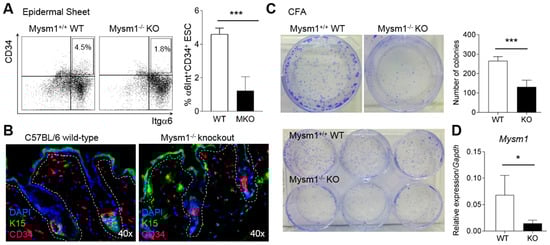Mysm1-deficiency affects epidermal stem cells. (A) FACS-analysis of α6-Integrin (α6Int)high+CD34+ fractions in epidermal single cell suspensions prepared from 8-week-old Mysm1−/− and wild-type mice (representative dot plots on the left and corresponding bar graphs of mean values on the right, n > 6); (B) IF analysis of K15+CD34+ cells in skin cryosections prepared from 4-week-old Mysm1−/− and wild-type mice (K15 in green, CD34 in red, DAPI-stained nuclei in blue, double-positive cells in yellow, n > 3, representative images shown, original magnification 40×); (C) Colony formation assay (CFA) under keratinocyte differentiation conditions with 4000 epidermal cells per well prepared from 8-week-old Mysm1−/− mice and their wild-type littermates (images of representative wells on the right and statistical summary on the left, n > 4, 3 independent experiments); (D) Mysm1 mRNA expression in colonies from either wild-type or Mysm1−/− progenitors relative to Gapdh.