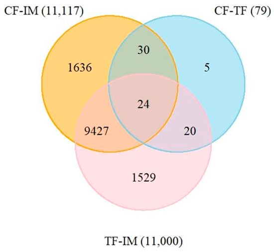 Analysis of DEGs by Venn diagram showing the number of DEGs in CF–TF, CF–IM, and TF–IM comparisons. All DEGs were determined on the basis of the statistical significance (false discovery rate (FDR) < 0.05).