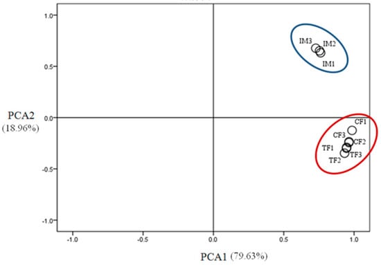 Clustering of control females (CF), high-temperature-treated females (TF), and high-temperature-induced neomales (IM) based on their gonadal transcriptome profiles by principal component analysis (PCA). Three individuals in CF and three individuals in TF formed a cluster (red circle), and three individuals in IM formed a distinct cluster (blue circle) on a PCA plot.