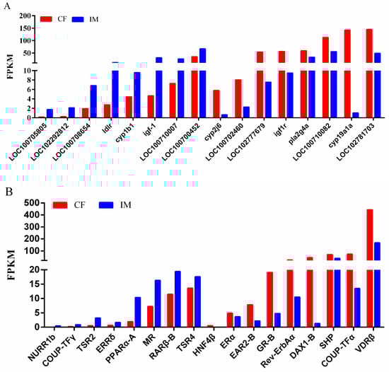 Expression profiles of major genes involved in steroid biosynthesis and metabolism (A) and from the nuclear receptor family (B) in Nile tilapia, displayed on the basis of their FPKM values from RNA-seq data from the CF–IM comparison. The FDR values of all comparisons are <0.05.