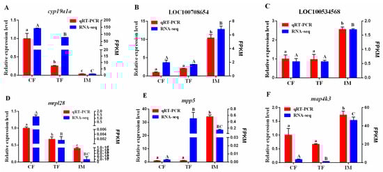 To validate the transcriptome results, a total of six DEGs that showed significantly different expression levels in at least one comparison group was selected for qRT-PCR analysis. Among them, three DEGs encode enzymes participating in steroidogenesis, namely, cyp19a1a, LOC100708654 (17-β-hydroxysteroid dehydrogenase 7, hsd17b7), and LOC100534568 (3-β-hydroxysteroid dehydrogenase type I, 3β-hsd), one DEG (mrpl28) was involved in energy metabolism and mitochondrial function, and two DEGs (mpp5 and map4k3) were involved in ovary development. As shown in Figure 6, the expression patterns of the six DEGs identified by qRT-PCR were generally similar to those obtained in the RNA-Seq analyses, although the relative expression levels were not completely consistent. For cyp19a1a and mrpl28, RNA-Seq and qRT-PCR showed mRNA expression downregulation in TF and IM compared with CF (Figure 6A,D). However, for mpp5, RNA-Seq analyses showed upregulated expression in both TF and IM compared with CF, while qRT-PCR indicated that there were no significant differences between CF and TF (Figure 6E). qRT-PCR analysis further confirmed the reliability and accuracy of the RNA-Seq data.
