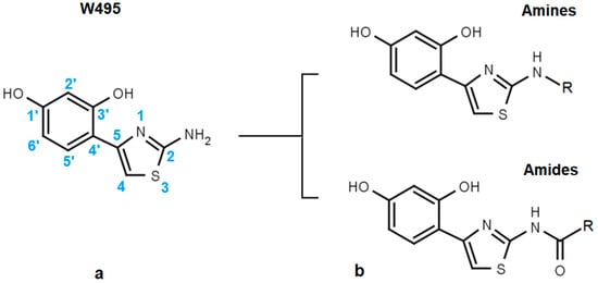 Basic structure of the resorcinyl thiazolamine inhibitors studied here is (a) the 4-(2-amino-1,3-thiazol-4-yl) resorcinol moiety. (b) Derivatization of the primary amino group of the resorcinyl thiazolamine W495 leads to either “Amines” or “Amides”, depending on the substituent.