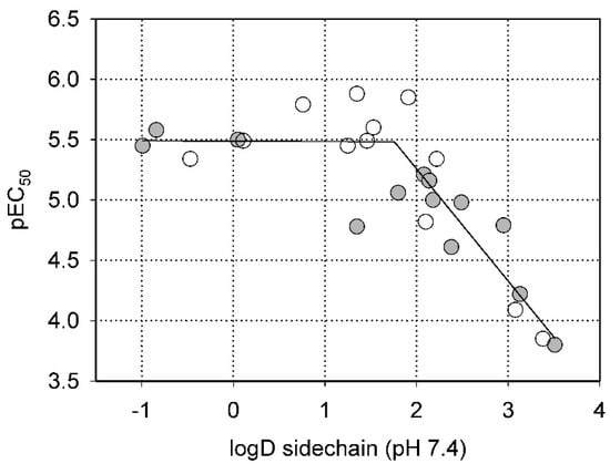 This conclusion is quantitatively illustrated by Figure 2, which shows the dependence of inhibitory activity on the polarity of the substituent at the 2-position of the thiazole ring. Clearly, in both series (amines and amides), more hydrophilic substituents with logD < 2 allow efficient inhibition, while pEC50 steadily decreases (i.e., EC50 increases) with logD values above that threshold.