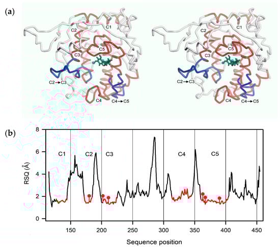 As mentioned above, the construction of viable tyrosinase models is greatly facilitated by the presence of a highly conserved core that contains most of the active site. For this part of the models, I-Tasser and other modeling programs like Phyre2 [] yielded excellent structural alignments. This is quantitatively illustrated by Figure 3b, which shows the RSQ (see above) for each residue of a top-ranking homology model of hTyr. The core segments that are denoted C1 to C5 include all six copper-coordinating histidines (red dots) and most of the residues interacting with thiazolyl resorcinol inhibitors (see Section 2.4).