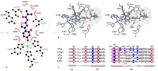 Virtual docking results for compound W630. (a) Interactions stabilizing the pose shown as LigPlot [] diagram; (b) Stereo representation of the lowest-energy docking solution. Only amino acid residues directly interacting with the bound inhibitor are shown (residue numbering includes the signal peptide). The di-copper center with the bridging oxygen is visible on the left with copper ions depicted as cyan balls. The ligand is shown in ball-and-stick representation, amino acid residues as sticks. The inner surface of the binding cavity is colored according to hydrophobicity on a scale from blue for hydrophilic to brown for hydrophobic; (c) Partial alignments of the CuA (left) and CuB sites (right) of several tyrosinases or tyrosinase related proteins. Copper-chelating histidines are highlighted in red, residues in contact with the bound ligand in blue, and the glycosylation site N371 in pink. Amino acids conserved in at least 4 sequences are shaded gray. Secondary structure elements and core regions (see text) are shown on the bottom. hTyr—human tyrosinase; hTrp1—human tyrosinase-related protein; bTyr—Bacillus megaterium tyrosinase; sTyr—Streptomyces castaneoglobisporus tyrosinase; mTyr—mushroom (Agaricus bisporus) tyrosinase. The bracket below the mTyr sequences denotes an extra loop.