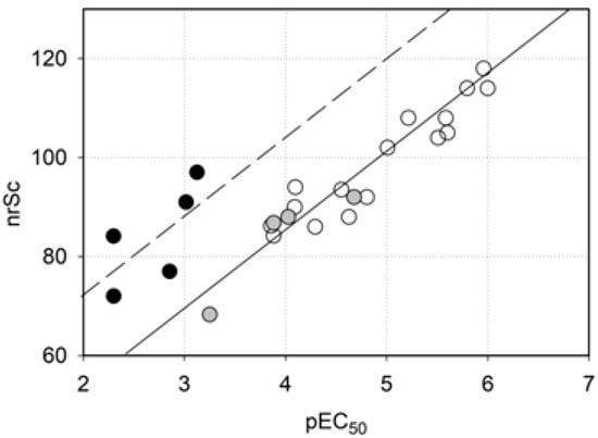 Inhibitory activity, as predicted by the negative rerank score (nrSc) provided by Molegro Virtual Docker (MVD), plotted against measured inhibitory activity (expressed as pEC50, the negative decadic logarithm of EC50). Open circles—amines and amides containing a thiazole ring; gray circles—4-alkyl resorcinols; black circles—compounds with other rings replacing the thiazole moiety.