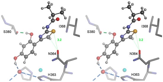 At first glance, the interactions of the thiazole ring of the ligands with our enzyme model appear to be predominantly hydrophobic. The ring is located in a pocket that is confined on the distal side by the side chain of Ile368 and parts of the peptide backbone, and by the side chains of Asn346 and Phe347 below the ligand. As calculated by MVD, the interactions of the thiazole ring contribute about one third of the total interaction energy (cf. Table S1). However, as will be discussed in more detail below, this is probably an underestimation.