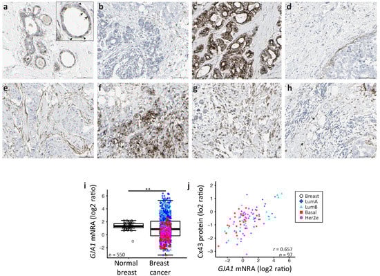 (a–h) The Human Protein Atlas normal and breast cancer tissue staining by immunohistochemistry for Connexin 43 (Cx43) (CAB010753 antibody). (a) Normal breast. Insert: Arrow head: myoepithelial cell’s staining; arrow: luminal cell’s staining. (b–h) Breast cancer tissue, (h) arrow: staining of spindle shaped stromal cells. Scale bar = 100 m. (i) GJA1 mRNA expression in breast tumor vs. adjacent normal breast tissue in the The Cancer Genome Atlas (TCGA) dataset. p value: * <0.05; ** <0.01; *** <0.001. (j) Scatter plot showing Cx43 protein and GJA1 mRNA level in tumors. In the legend, “Breast” indicates adjacent normal breast tissue. Pearson’s correlation coefficient is given (r).